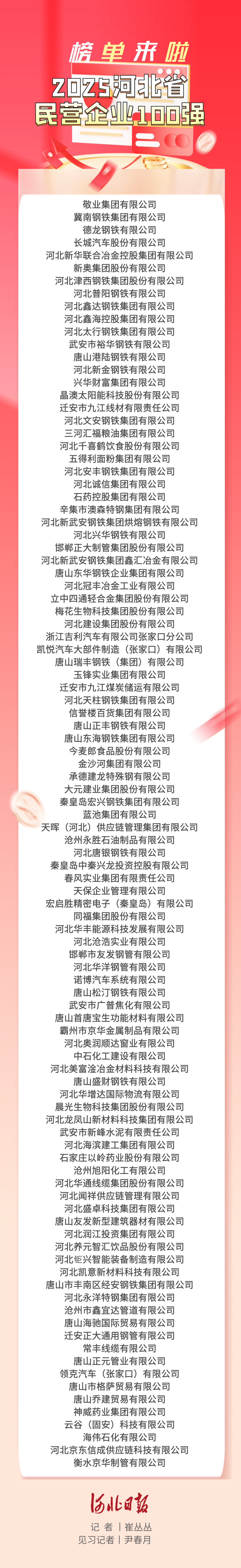 9月9日,河北省工商联在沧州举行2025年河北省民营企业100强发布会,发布2025河北省民营企业100强榜单。河北这些企业上榜,具体名单如下↓↓↓
