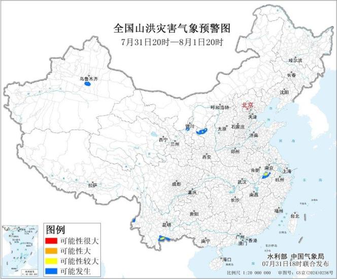 7月31日18时,水利部、自然资源部、中国气象局等多部门发布山洪灾害气象预警、暴雨黄色预警、地质灾害气象风险预警。